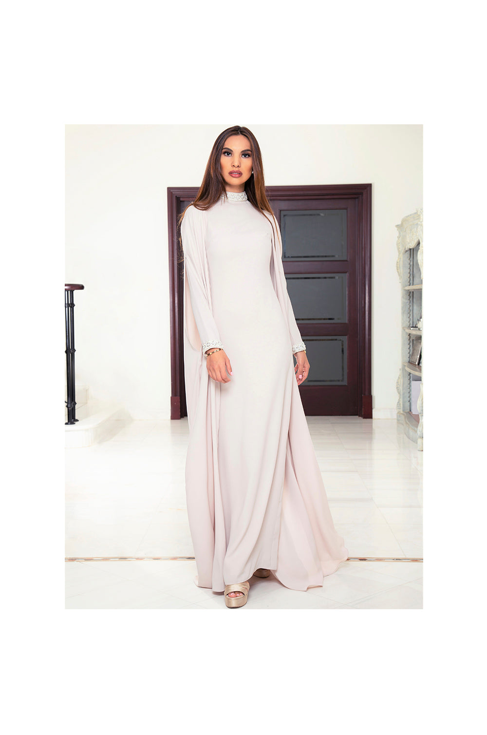 Our LAMACE nude cape gown with crystal and bead embellished cuffs and collar !!  Sophisticated and glamourous yet easy to wear!!  Team with simple neutral heels and clutch for a show stopping day to night look!!