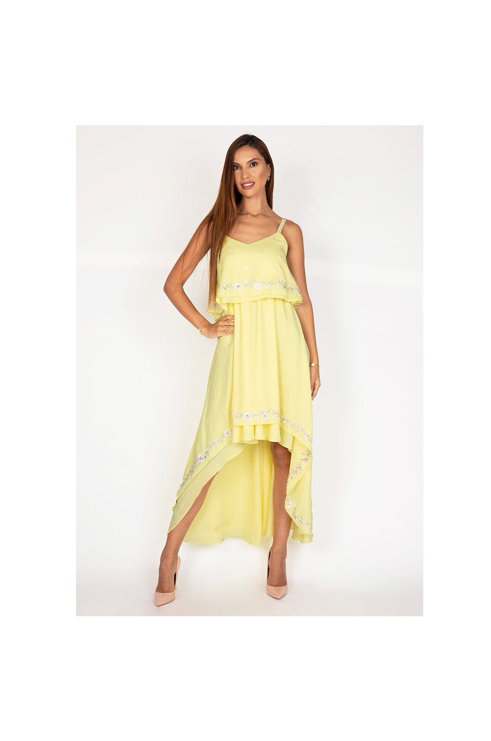 Yellow High Low Day Dress with Embroidery