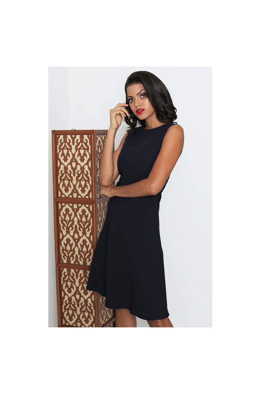 Perfect for daytime chic! Our LAMACE blue A-line midi dress! Form fitted at the bust with a-line cut from the waist! Soft and light crepe material in dark blue hue reflects the light and moves elegantly as you walk! Team with a simple black or nude heel for a chic and sophisticated look!