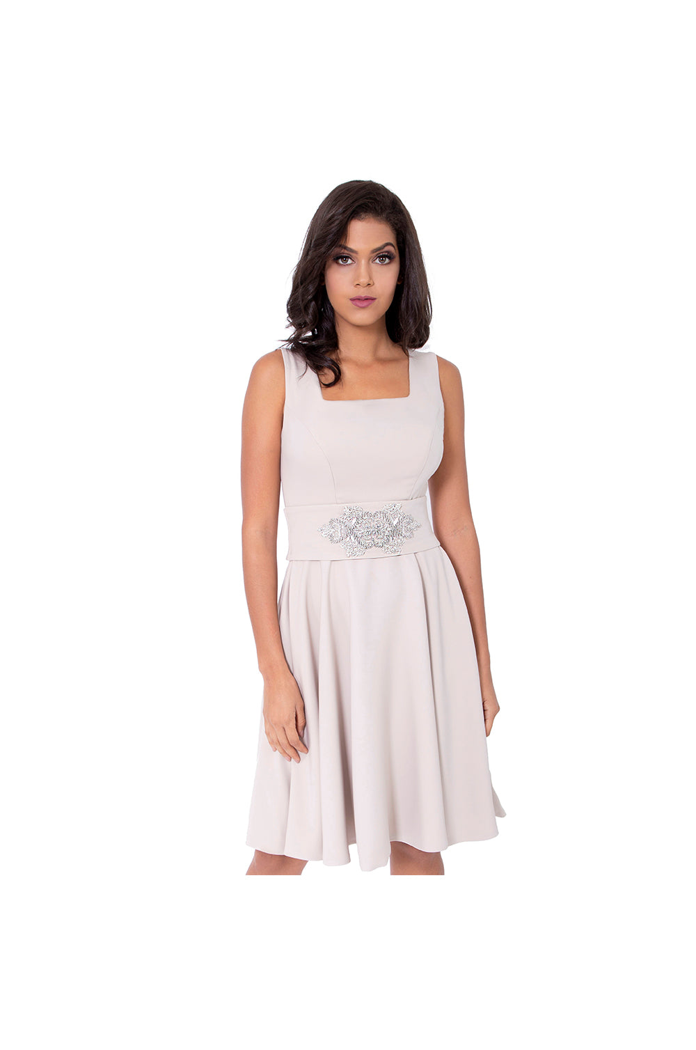 Nude Crepe Day Dress with Crytsal Embellished Belt