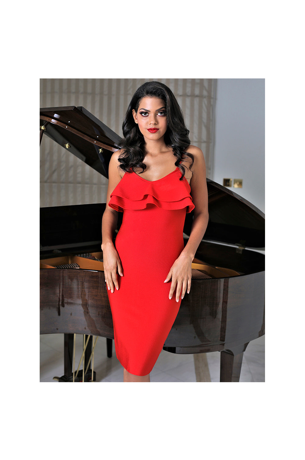 LAMACE red knitted midi dress with ruffled neckline!!  Cut for a tight fit with body con fabric to hug the body and provide support and shape.  In stunning red colour, this piece is the perfect eye catching look for any event!!  Team with a simple nude heel and clutch!!