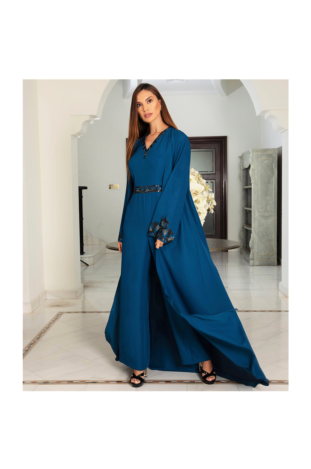 Our LAMACE blue jumpsuit with detachable cape and  sequin embellishments!!  Sophisticated and glamourous yet easy to wear!!  Team with simple black heels and clutch for a show stopping day to night look!!