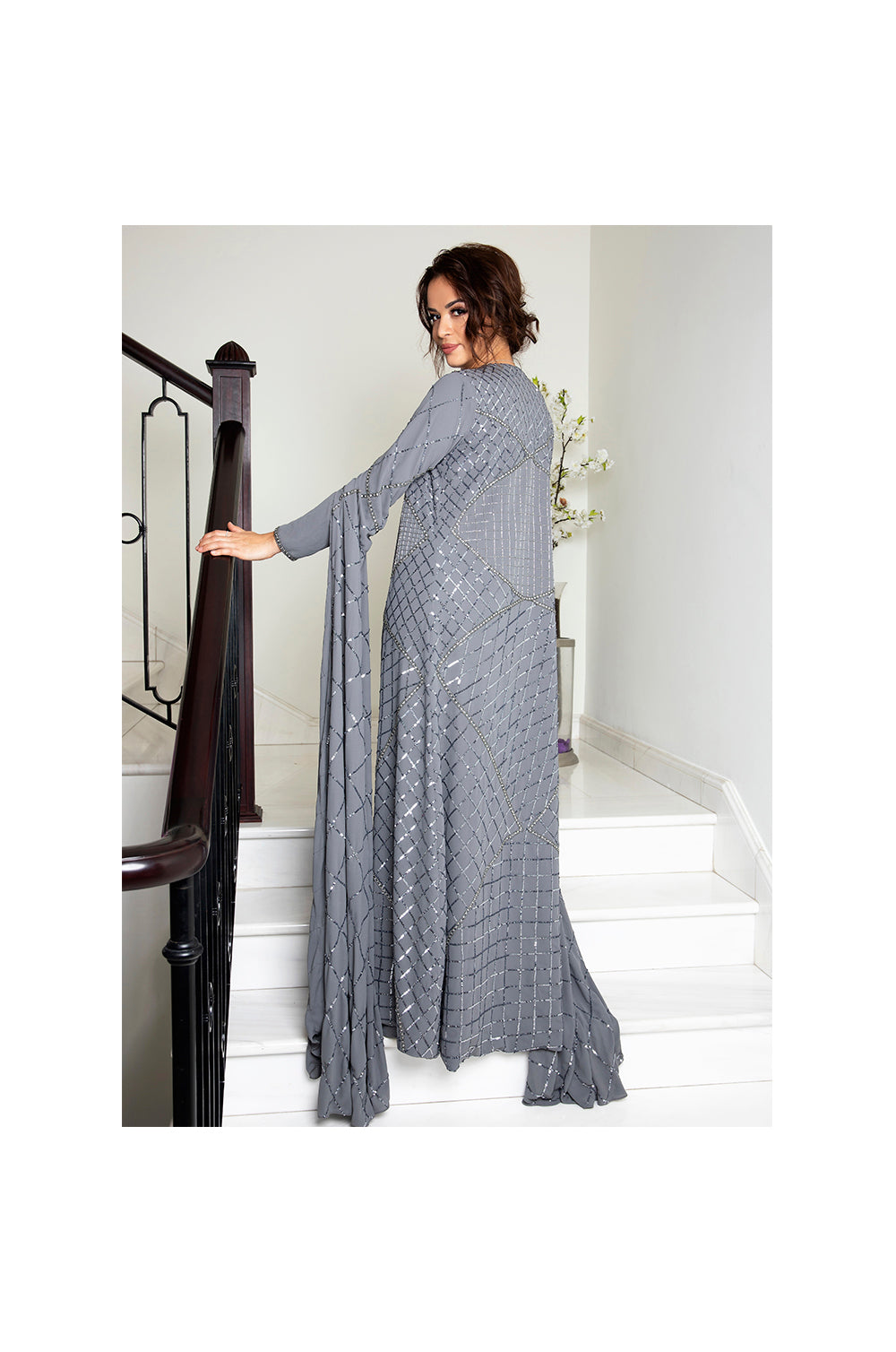 Our LAMACE grey fully embellished cape dress is the ultimate in sophisticated glamour and elegance !!Fully embroidered and meticulously embellished by hand with thousands of individual beads and sequins. Team with a simple silver heel and clutch for an exquisite evening look.