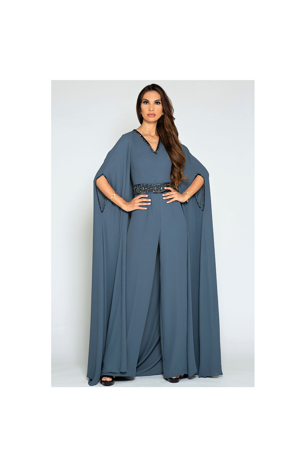 Our LAMACE grey/blue jumpsuit with detachable cape and crystal embellished neckline and waist!!  Sophisticated and glamourous yet easy to wear!!  Team with simple black heels and clutch for a show stopping day to night look!!