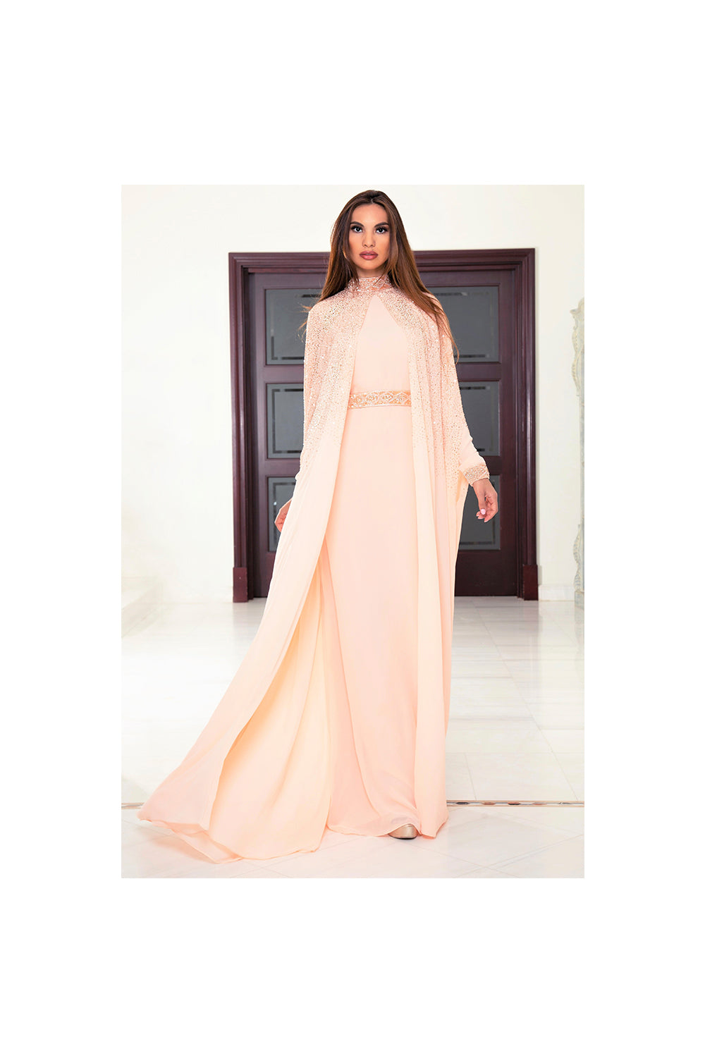 Our LAMACE peach sequin and bead embellished cape dress is the ultimate in sophisticated glamour and elegance !! Meticulously embellished by hand with individual beads and sequins. Shown with matching detachable matching necklace and belt. Team with a simple silver heel and clutch for an exquisite evening look.