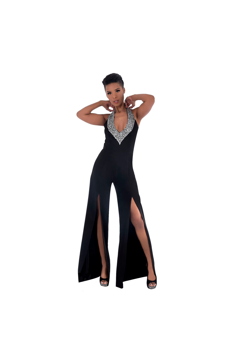 Our show stopping LAMACE black jumpsuit with full crystal embellished neckline!! Made with crepe material and with front slits to the leg, you will shine all night!! Deep V Neck cut is surrounded by over 200 individually hand placed crystals. Team with a black or silver heel for a head turning party look!!