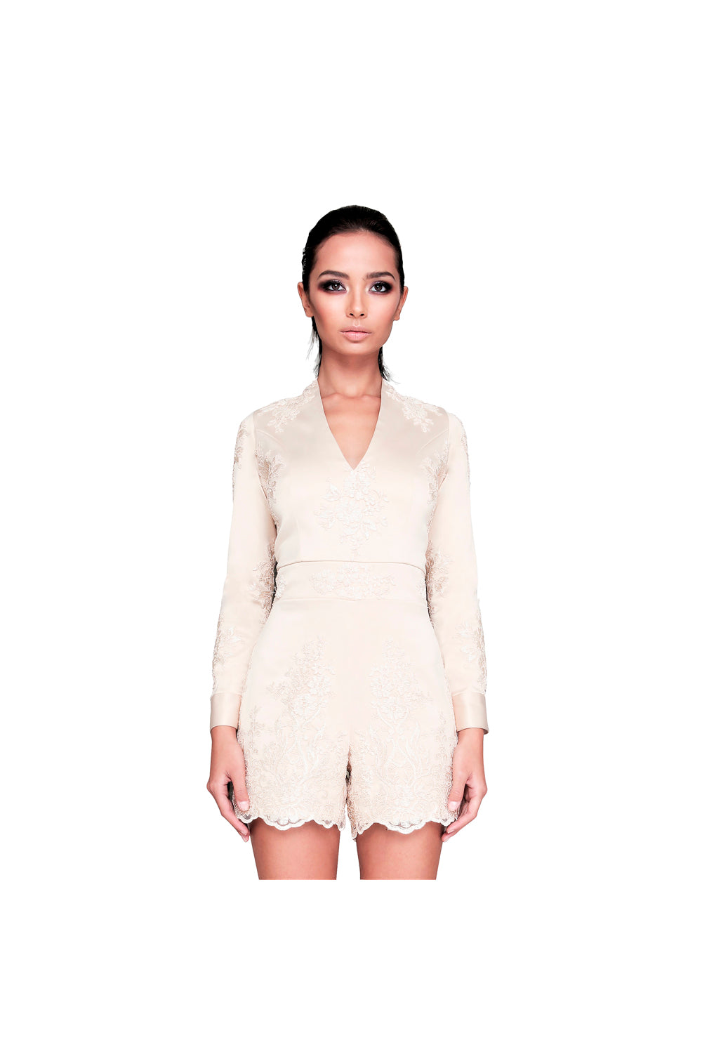 Perfect for summer! Our light gold satin playsuit has been hand embellished with fine lace, to give a beautiful tailored finish. Easy to wear and perfect for a day or night look, wear with a gold or nude heel for an effortlessly chic look.